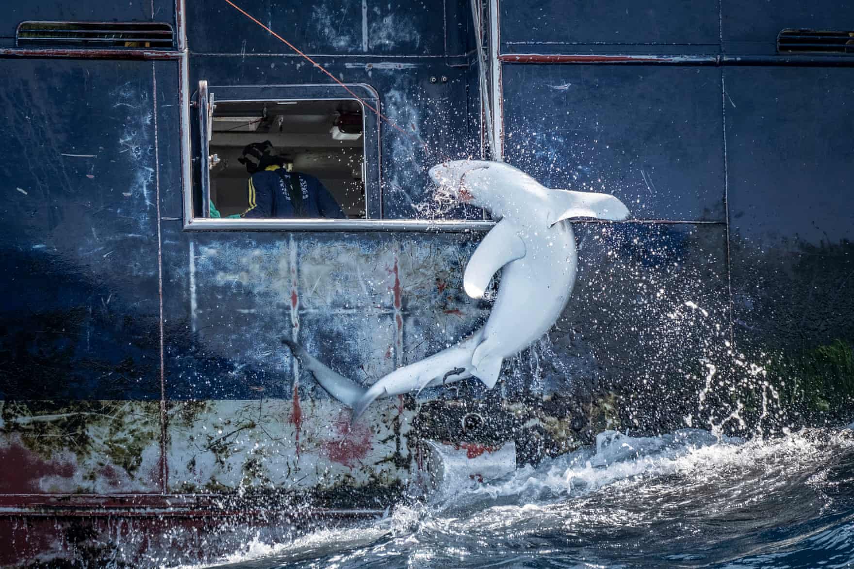 Cắn câu, nhiếp ảnh gia Tommy Trenchard, Nam Phi. Tommy Trenchard ghi lại cảnh bắn một con cá mập, cơ thể nó uốn cong trong hành động kháng cự cuối cùng.